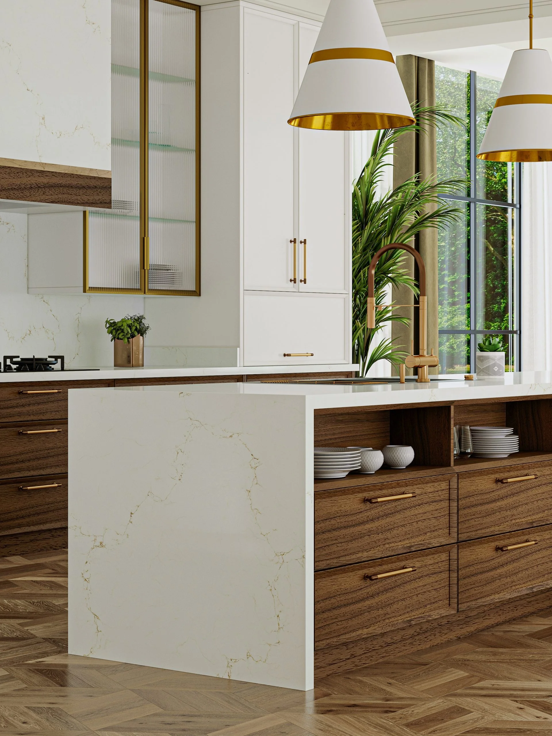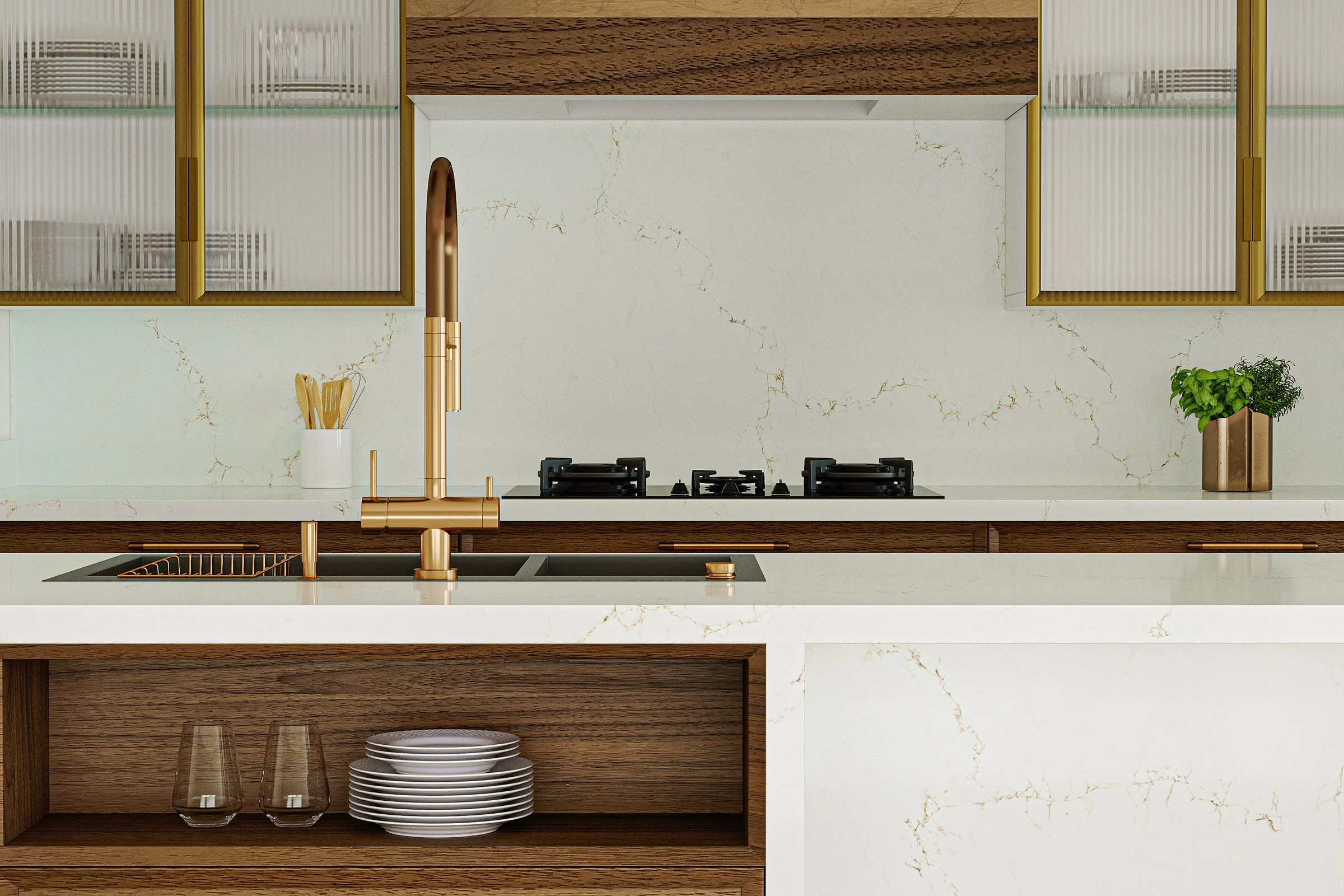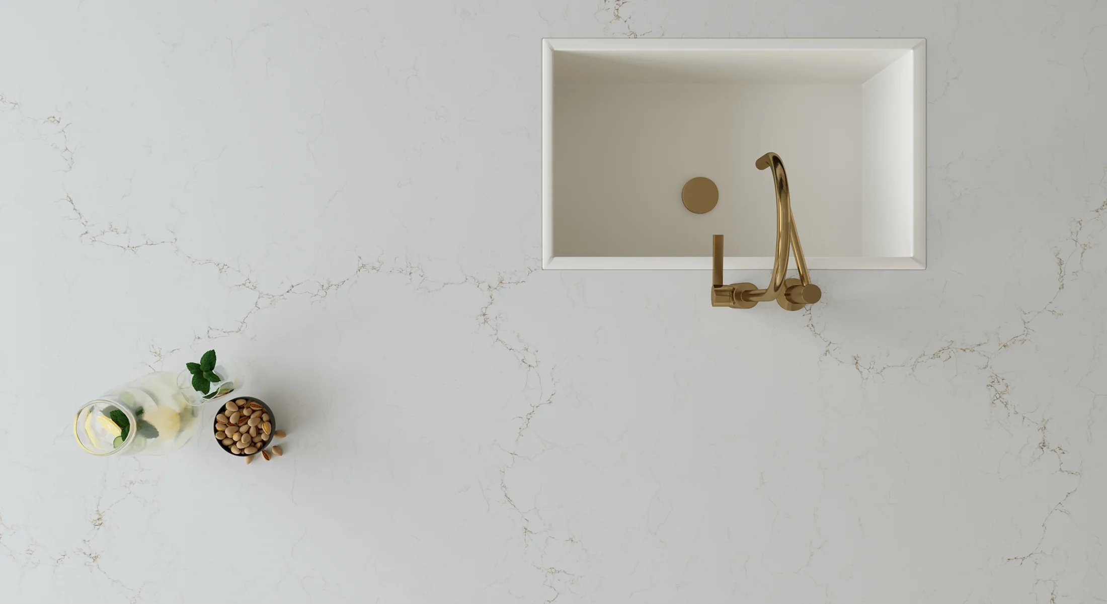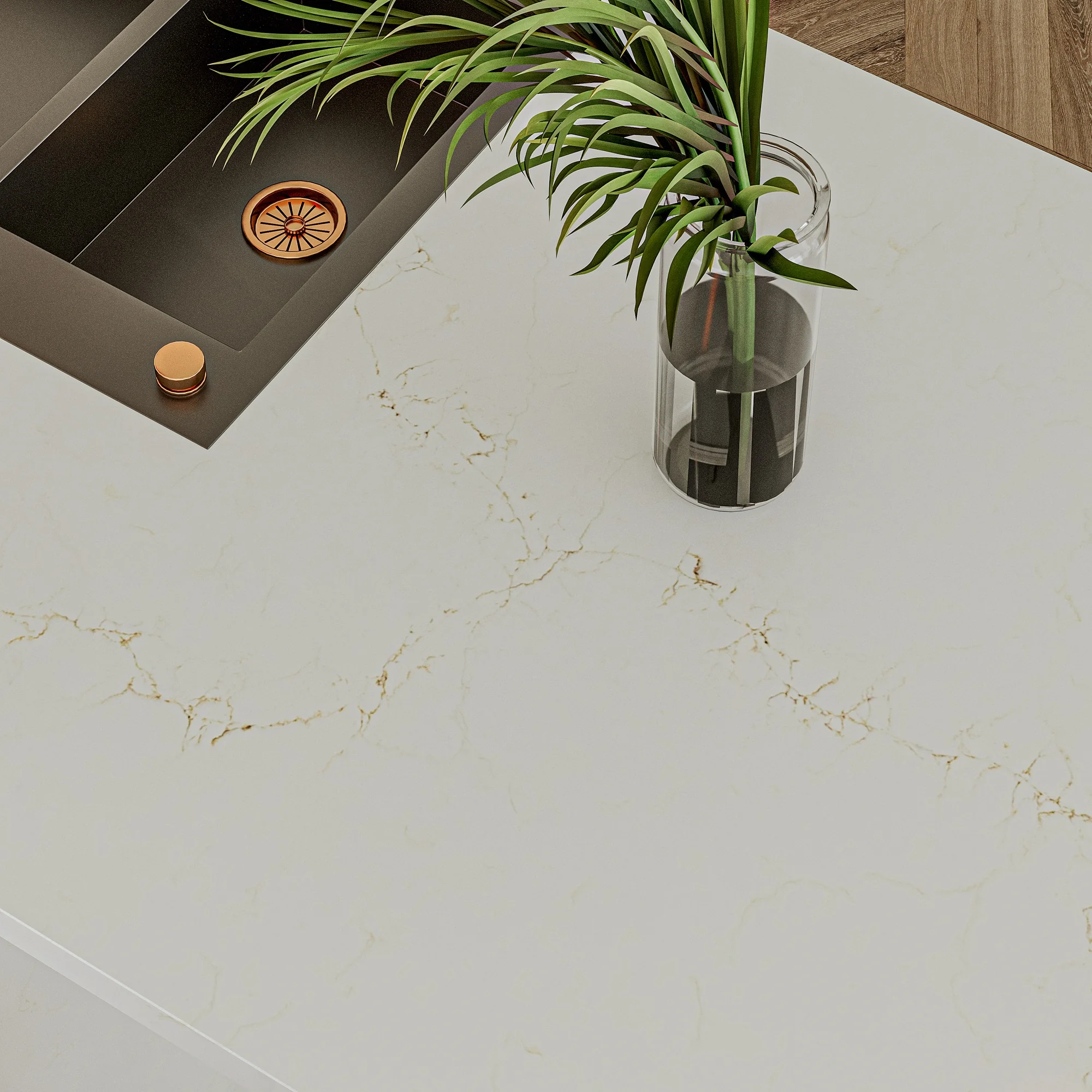 Vicostone Misterio Gold présente un entrelacement de veines brunes et dorées sur un luxueux fond imitation marbre blanc. C’est l’un de nos modèles les plus populaires pour son élégance et son esthétique naturelle.